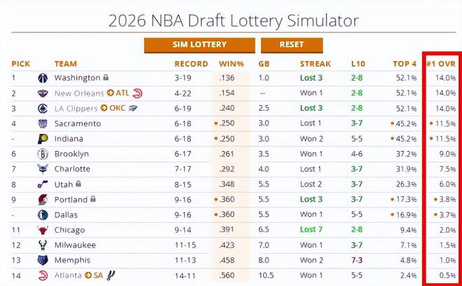 今天NBA迎来一场焦点对决,洛杉矶快船队客场113-115惜败火箭队,此役过后快船战绩跌至6胜19负排在西部倒数第二,全联盟排名倒数第三!熟悉NBA规则的小伙伴都应该明白,一支球队的战绩将最终决定该球队在下一个休赛期的选秀权位次。此役过后快船获得下个休赛期状元签概率达到了14%,与奇才、鹈鹕并列联盟第一,按照目前这种局面快船最差签位都跌不出联盟前7!